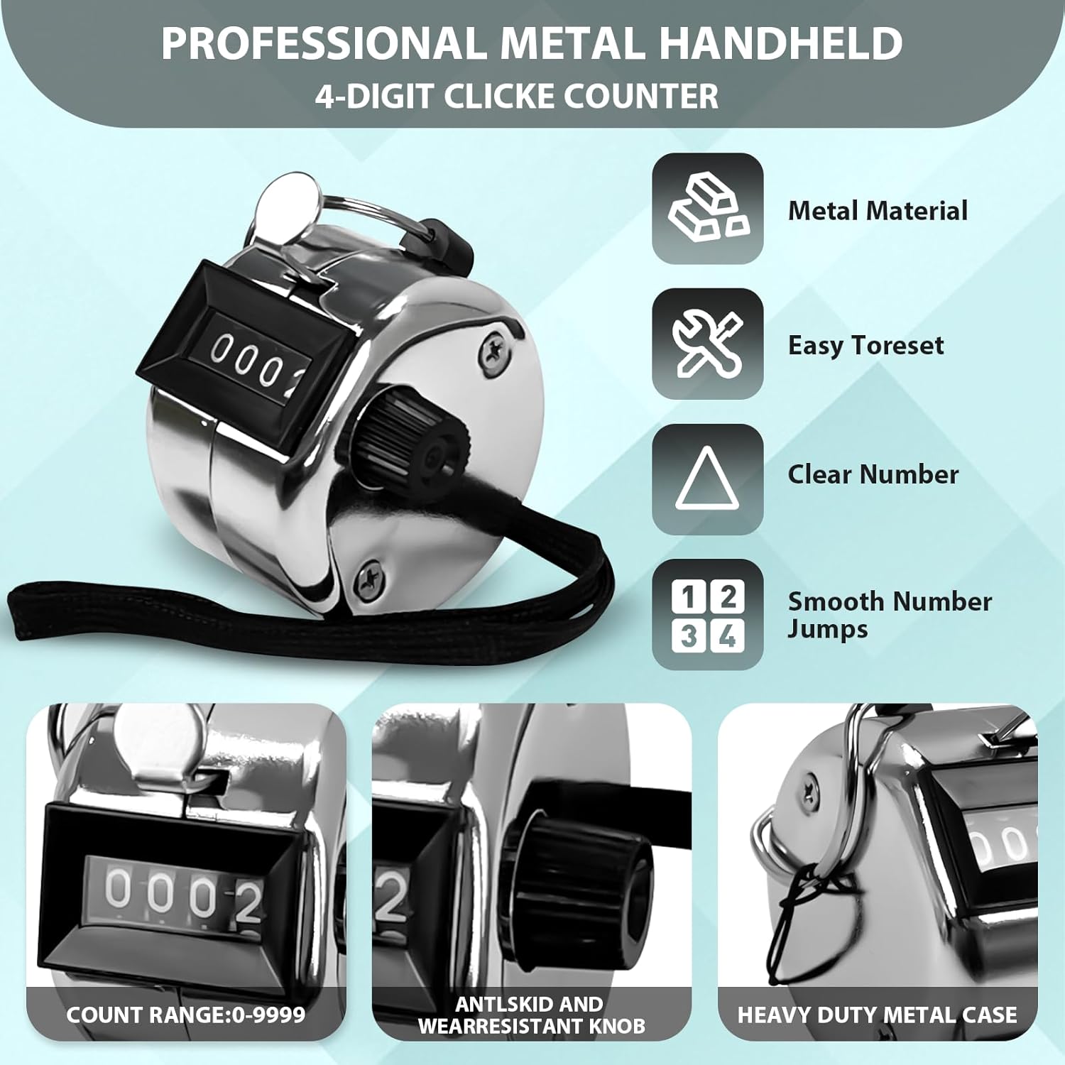 [USER-FRIENDLY]: Our clicker counter can tally up to a maximum of 9999 counts.Resetting is a breeze—just a few clockwise turns of the reset knob will do the trick.With its powerful functionality and convenient operation,this counter clicker is designed to meet your counting needs effortlessly!
