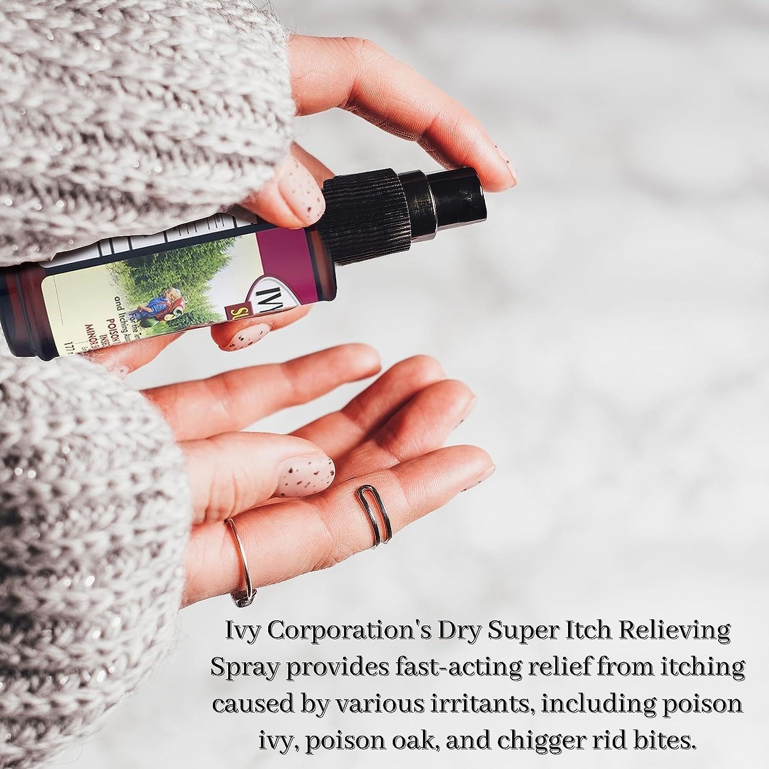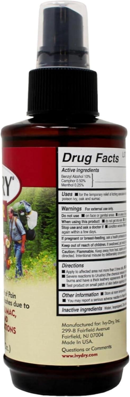 Ivy Dry Super Anti-Itch Spray provides fast, effective relief from itching and discomfort caused by insect bites, poison ivy, poison oak, poison sumac, and other minor skin irritations. Formulated with benzyl alcohol, camphor, and menthol, this external analgesic helps soothe irritated skin while delivering cooling comfort. The easy-to-use spray format allows for quick application without touching the affected area, making it a convenient option for home or outdoor use. NDC Code(s): 49546-106-06