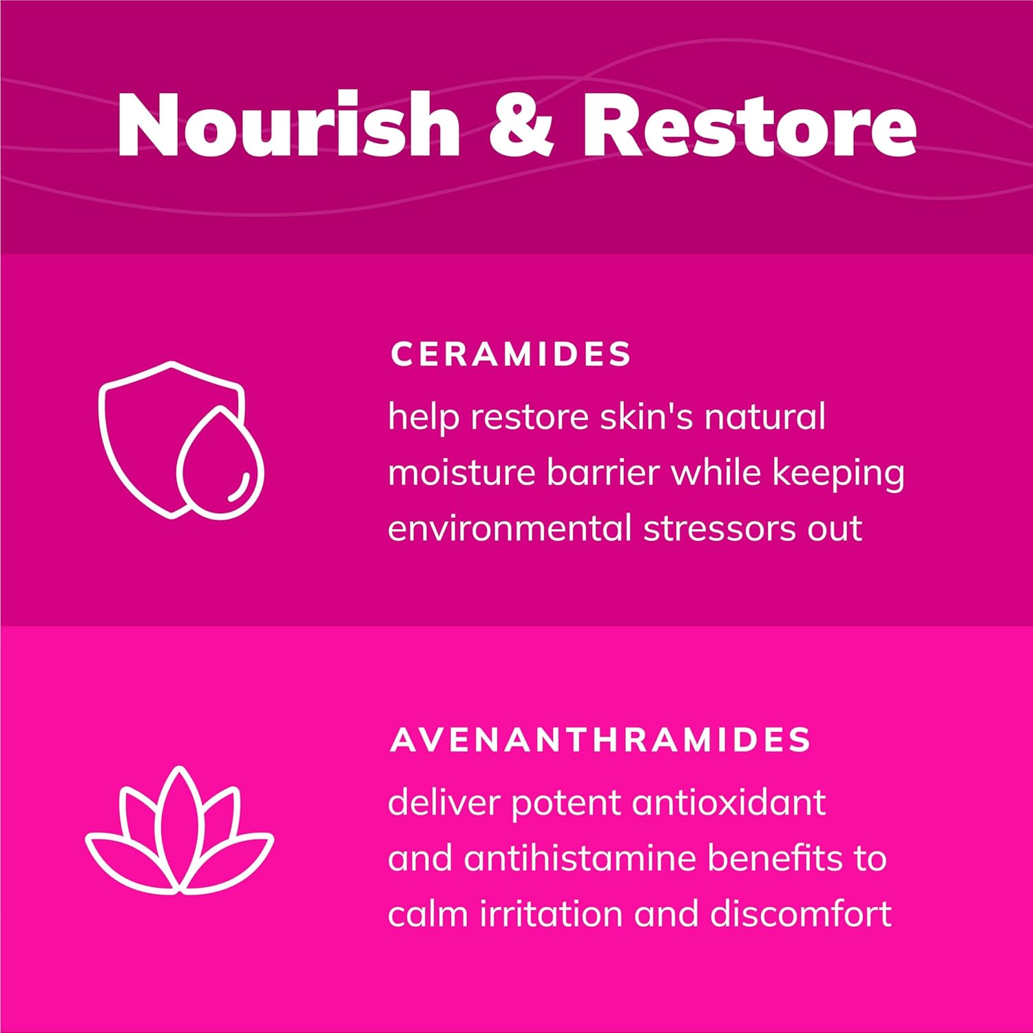 Contains skin nourishing ceramides and avenanthramides that moisturize and calm skin and support the skin’s natural immune system and provide building blocks for renewed skin barrier integrity