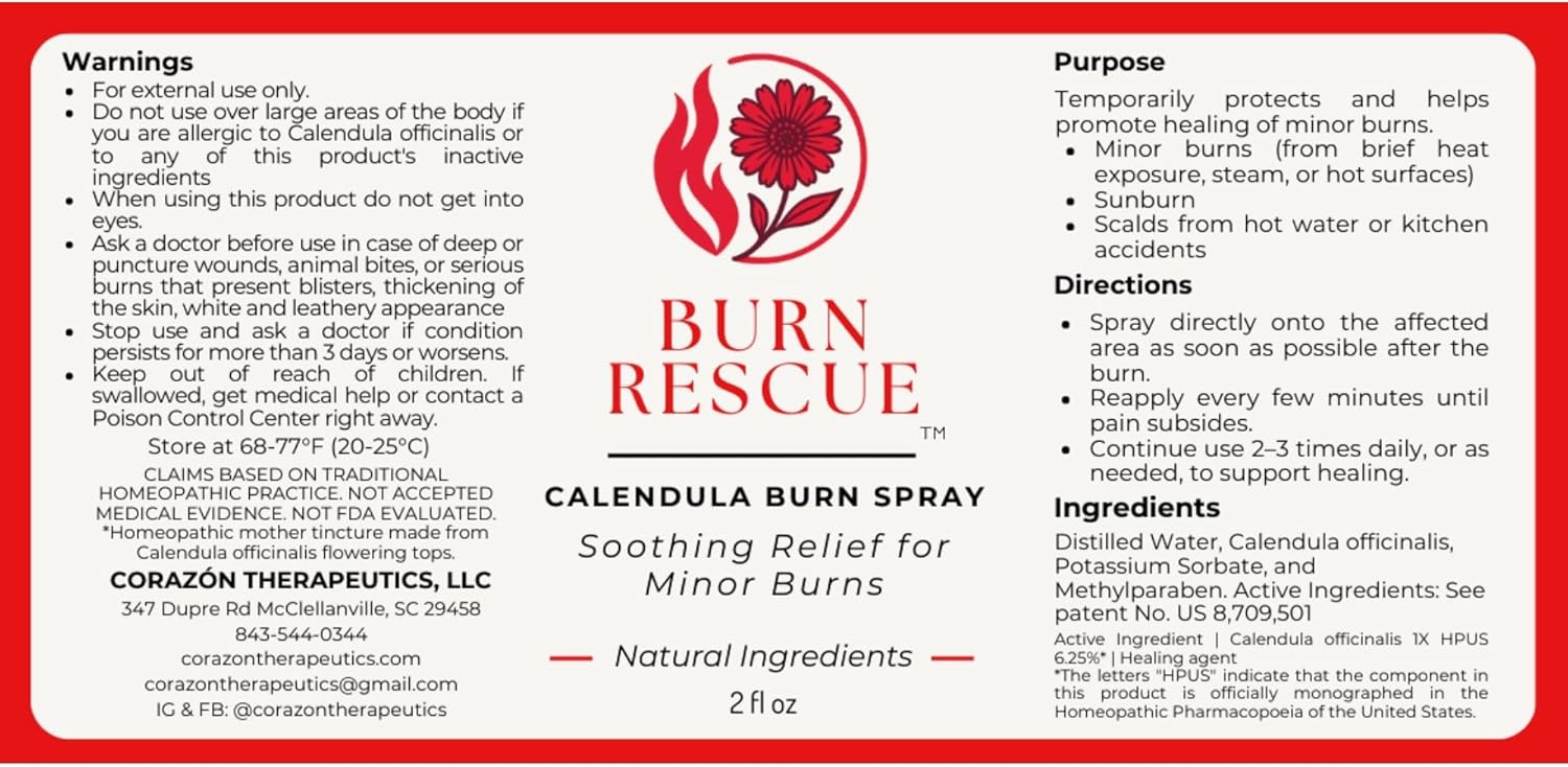 Discover quick relief from minor burns with Corazon Therapeutics Burn Rescue Calendula Spray. This 2 oz spray provides soothing comfort for minor burns from brief heat exposure, steam, or hot surfaces. The natural calendula-based formula is easy to apply – simply spray directly onto the affected area and reapply as needed until pain subsides. For optimal results, use 2-3 times daily to support the healing process. The convenient spray application makes it ideal for kitchen accidents and other minor burn incidents. Store between 68-77°F for best results. This external-use product contains natural calendula officinalis in a homeopathic preparation. Please note that this product is for minor burns only – seek medical attention for serious burns or if condition persists. Keep out of reach of children and avoid contact with eyes. Claims are based on traditional homeopathic practice.