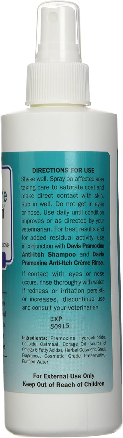 Davis Pramoxine anti-itch spray provides amazing relief from itching and scratching for pets. This easy-to-use anti-itch spray helps relieve chronic pruritis and is excellent for spot relief between baths. Helps condition the skin and prevent dryness. Contains 1 percent Pramoxine hydrochloride, colloidal oatmeal, borage oil (source of omega 6 fatty acids), herbal cosmetic grade fragrance, cosmetic grade preservative, purified water. Safe for dogs, cats, puppies and kittens. Available in 8-ounce spray bottle. Measures 7-1/2-inch length by 2-inch width by 2-inch height.