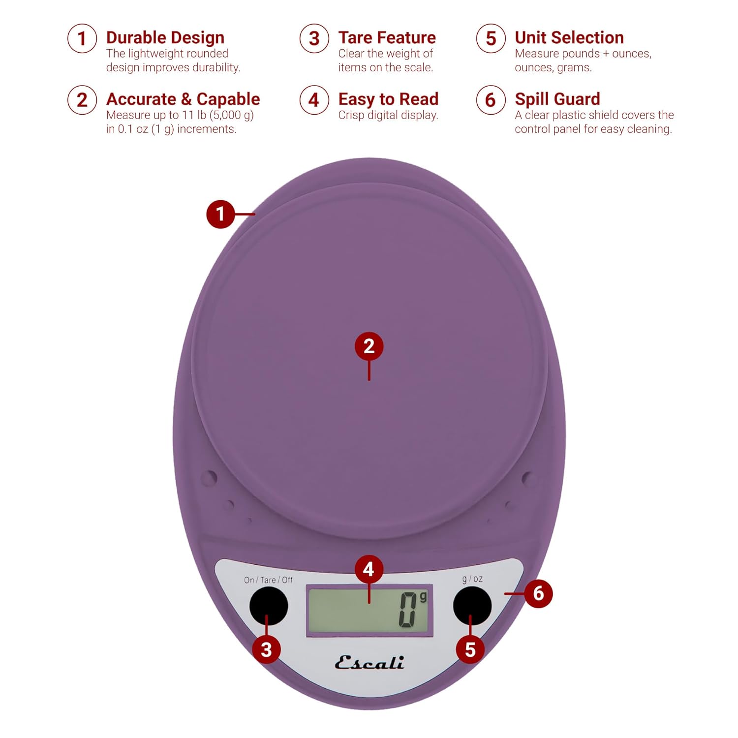 Colorful Best Seller: Twice rated as a best value by a leading independent consumer magazine; the Escali Primo Digital Scales are multifunctional and feature an easy to use two-button operation. The sealed control panel and rounded design make the scale easy to keep clean and very durable. Available in a selection of colors. Simple Two-button Operation: The two-button controls are easy to operate and ensure quick and efficient use. Sealed Control Panel: The display and controls are sealed under a protective shield to guard against accidental spills. Tare Feature: Reset the scale to zero weight to measure multiple items or subtract the weight of container. Automatic Shut-off: The bakers scale will turn off after four minutes of inactivity to help conserve and extend battery life. Optional Stainless Steel Platform: A dishwasher safe stainless steel platform cover is available separately. Additional keywords: food scale digital, kitchen scales digital weight