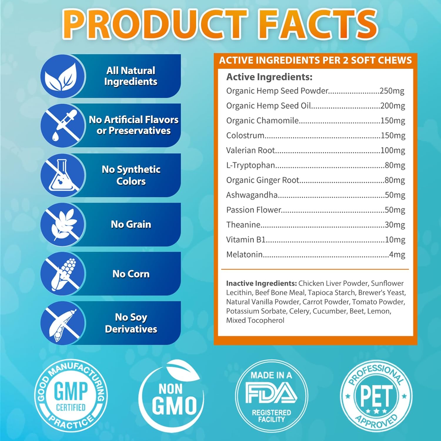 Natural Ingredients, No Additives: Our dog calming treats are made without soy derivatives, grains, or corn, and contain no artificial colors or flavors, as well as no harmful additives. Each dog hemp chew is crafted from vet-recommended ingredients, ensuring effectiveness. By choosing natural calming ingredients, we prioritize your pet’s health, offering a soothing option for alleviating dog’s anxiety and stress.
