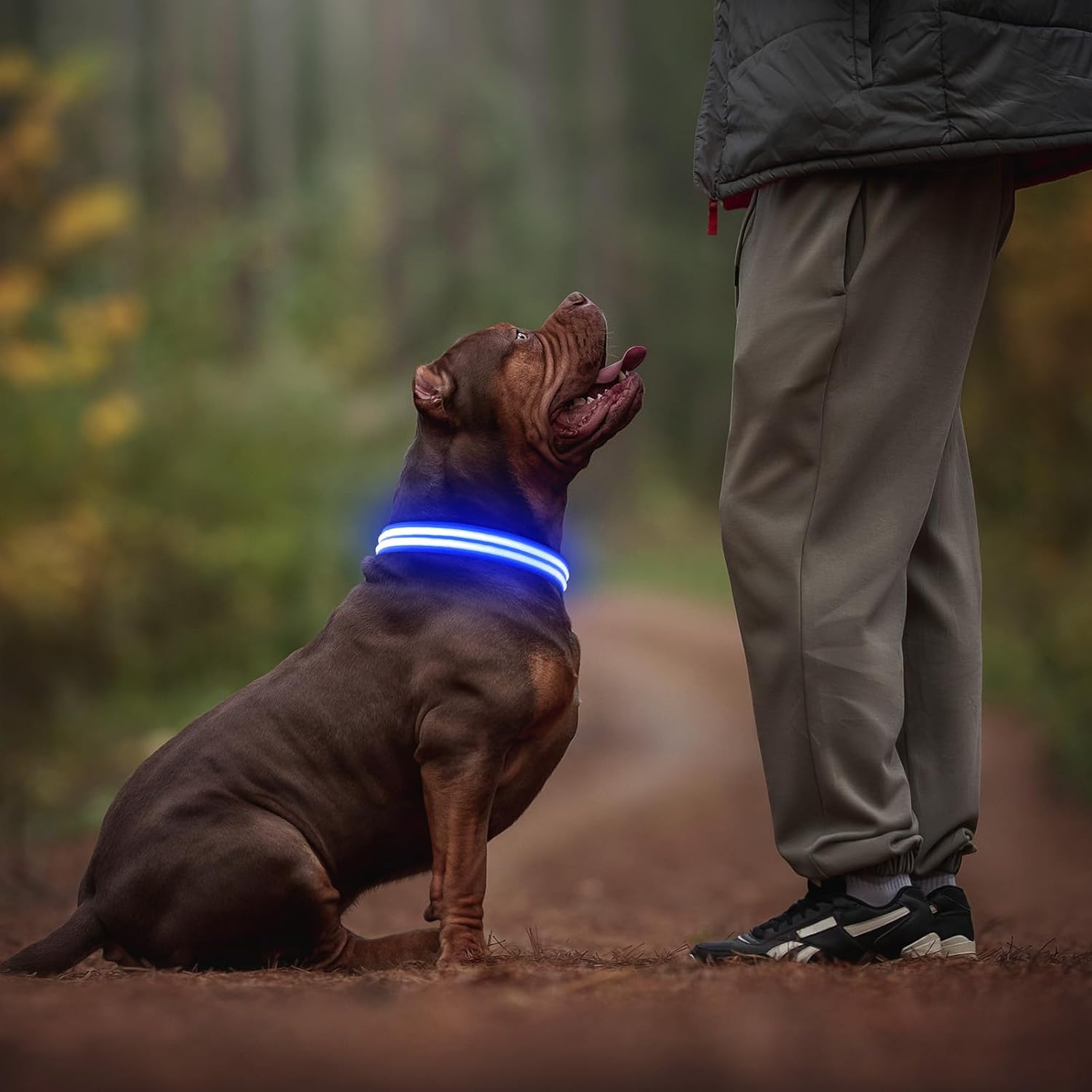 【SAFETY LED COLLAR】our Illumifun LED dog collar crafted from nylon webbing with a built-in light guide, it ensures your dog is seen up to 500 meters. Perfect for night walks, jogging, or camping to prevent accidents.