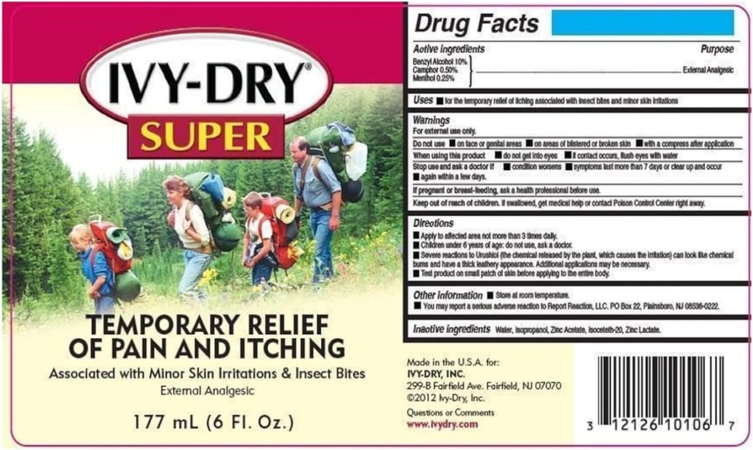 Ivy Dry Super Anti-Itch Spray provides fast, effective relief from itching and discomfort caused by insect bites, poison ivy, poison oak, poison sumac, and other minor skin irritations. Formulated with benzyl alcohol, camphor, and menthol, this external analgesic helps soothe irritated skin while delivering cooling comfort. The easy-to-use spray format allows for quick application without touching the affected area, making it a convenient option for home or outdoor use. NDC Code(s): 49546-106-06