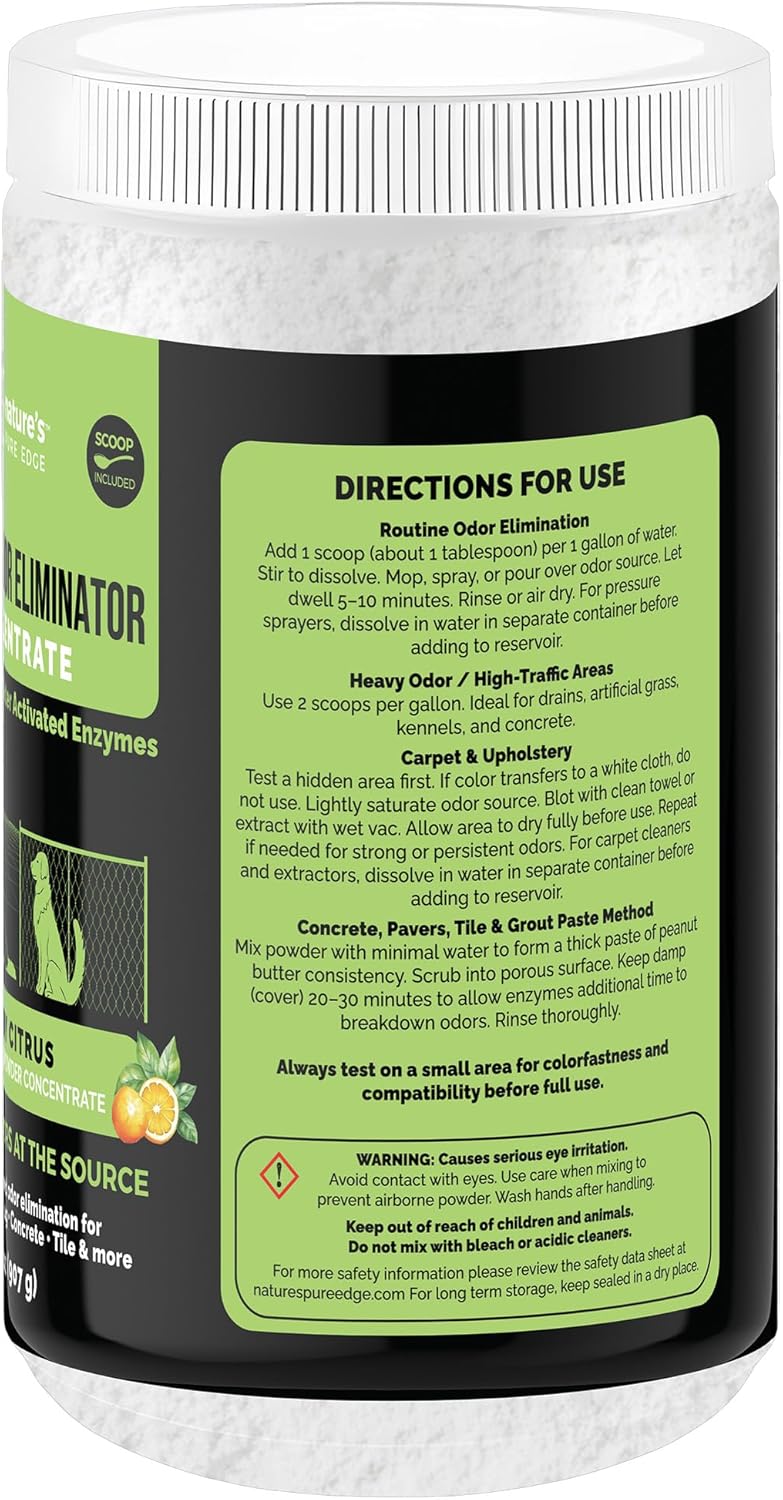 Dry Enzyme Powder with Easy Mix Scoop-Unlike bulky, spill prone liquid cleaners, this enzyme fresh odor eliminator dissolves fast in water. Scoop included for simple mixing. The most effective odor removal comes from specialized enzymes that target the source itself. Carpets, rugs, hardwood floors, tile, concrete, and astro turf. Simply the best for strong odor, 32oz enzyme pet odor remover.