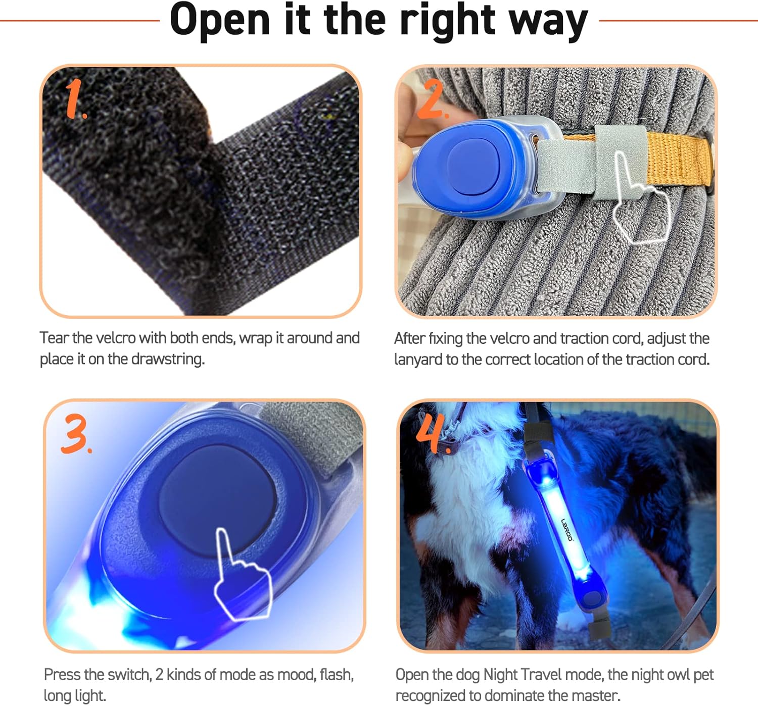 I ended up having to safety pin this to my dog’s leash because the velcro was such garbage that it either bunched up or fell off. After 2 months of being a pain I noticed it had gotten dramatically dimmer and then the next day it didn’t work at all. The battery was supposed to last much longer.I don’t recommend this product. I’d just buy a light up leash or collar instead.