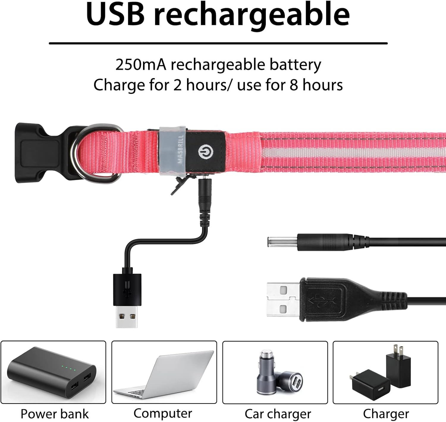I’ve used several brands. Each has good points and bad design decisions. This one was ordered in “Small” “Pink” as seen in the photo. Also note that, in this photo, the collar has been sized to fit a doggie with only 11.75″ circumference neck. When made this small, as the recommended size range for this “SMALL” collar, you’ll find that one of the only FIVE LEDs ends up underneath the exposed collar. This is because MASBRILL manufacturer decided to use a peculiar “captive” type of buckle arrangement instead of a more conventional design in which there will be a dangling free end after you size down the collar from maximum length. This is nice for the dog, but it makes for a giant headache if user’s dog needs to adjust down the collar from its maximum length. Note also in the photo I took, which is a better angle than the photo that MASBRILL supplies: the collar material surrounds the power supply box, which is fully 2″ long and it’s a hard, stiff, unbending chunk! This chunk will press against your dog’s neck, unless you have a larger dog, in which case there isn’t much noticeable chunkiness. The buckle and attachment ring are HUGE and quite robust; again, better suited to a larger sized doggie. Keep in mind also, to make the unit “waterproof” (read as “moisture-resistant if splashed lightly with water”) there is a weird rubber bootie that inserts down into the 2.5 mm cylindrical charging port. Sure, that will keep most splashed water out, until you wear out or accidentally rip off the bootie/plug thing, which is very tiny. And, you need to keep track of the 12″ long USB-to-Barrel cable 2.5″. NO Micro-USB handy plug-ins for YOU !! Fortunately, the rechargeable sealed battery pack is 250 maH Lithium-Ion, so you’ll get about 10-16 hours use on continuous light and double that on Epilepsy-inducing flashing modes…. When you plug in the charging cable, all the LEDs will light up at 50% bright. This waste of power allows the battery pack to fully charge in about two hours … again, using the proprietary charging cable. Don’t get me wrong, this collar is looking like a higher than average quality piece of kit. Just don’t use it on a dog with a skinny neck.I’ll update this review if/when the dog collar power system fails. So far, other similar brands on Amazon have lasted about two years before becoming completely color faded and, more importantly, light-less due to electrical failure.