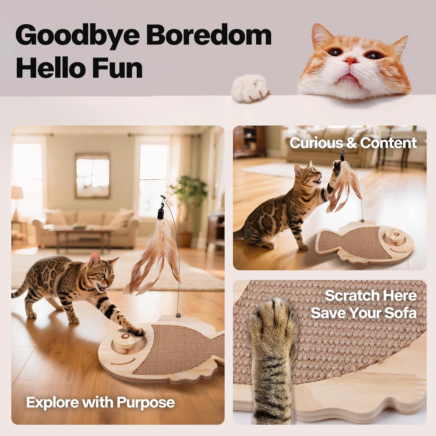 🌿 Natural Sisal Scratching Pad & Wooden Base – Made with 100% natural sisal cat scratcher material and durable pine wood, this cat scratching board is more long-lasting than a cat cardboard scratcher, providing a stable scratch pad for cats that promotes healthy claws and safe playtime.