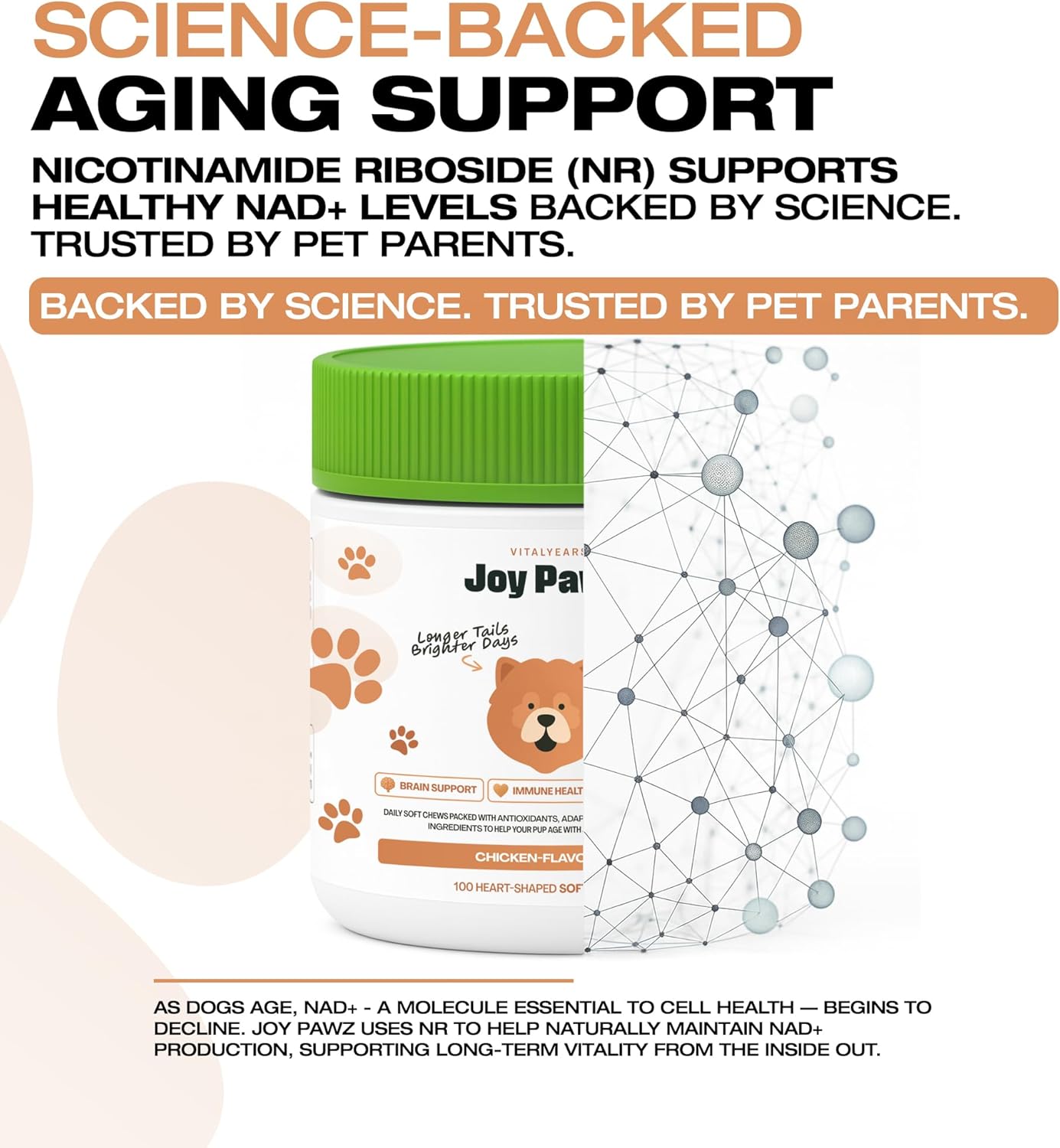 ✅ Anti-Aging Longevity Formula with NAD+ Support – Powered by Nicotinamide Riboside (NR) to support NAD+ levels, Joy Pawz helps senior dogs maintain youthful energy, cellular repair, and cognitive clarity. Perfect for mature dogs or those showing signs of dementia.