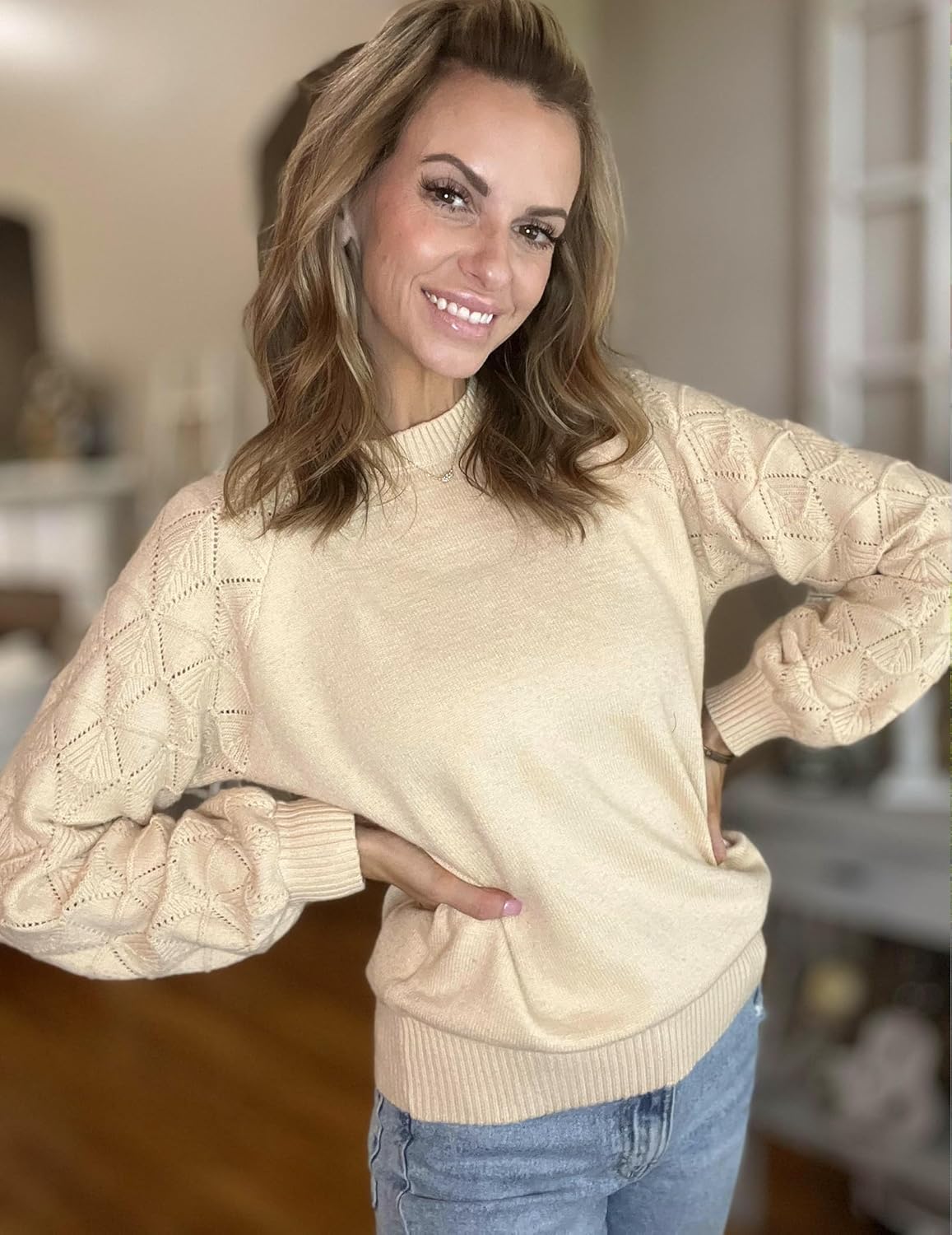 Stylish Design– cute crew neck and long lantern sleeves with crochet eyelet and hollow details, adding a touch of uniqueness and fashion to your outfits.